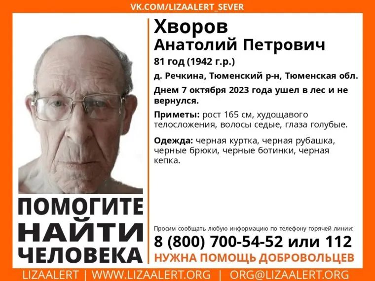 В Тюменской области пропал 81-летний Анатолий Хворов, который 7 октября ушел в лес и пропал. Об этом сообщил поисковый отряд «ЛизаАлерт».