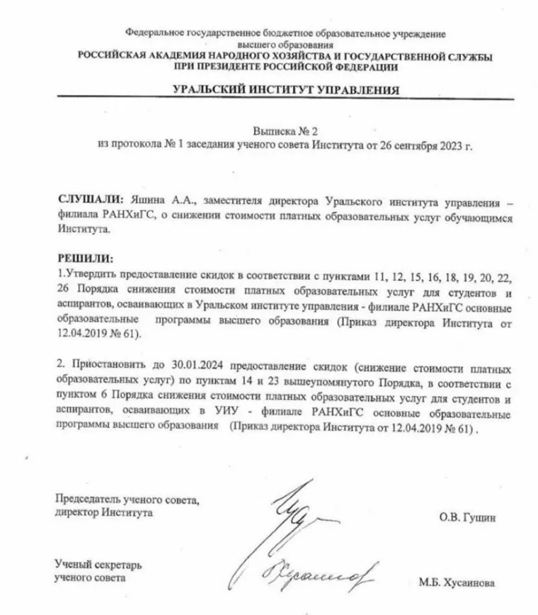 «Уральский институт управления — филиал РАНХиГС продолжает выполнять все обязательства перед студентами, в том числе по предоставлению социальных скидок. Дополнительно введены новые скидки участникам специальной военной операции и членам их семей. Решением Ученого совета вуза было приостановлено предоставление скидок в нескольких категориях: за хорошую учебу и внеучебную деятельность, до утверждения нового положения о скидках. Скидки по остальным категориям студентам предоставляются», — отметил замдиректора института Александр Яшин.