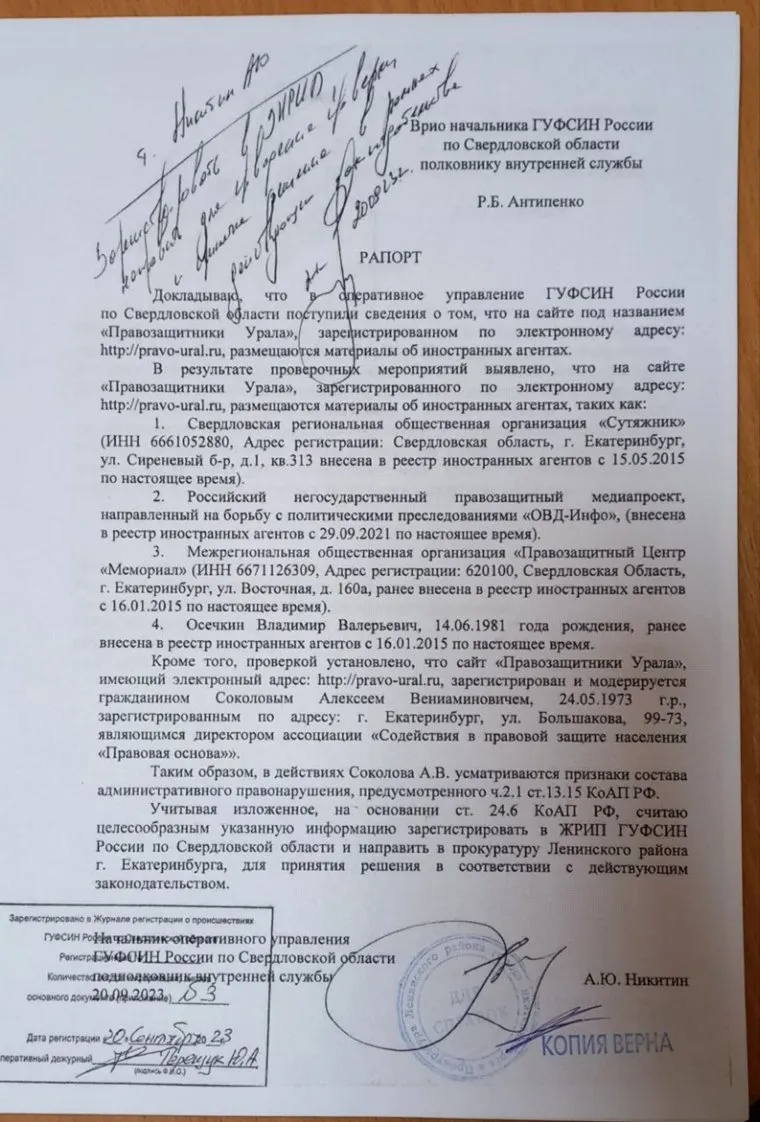 Рапорт начальника оперативного управления ГУФСИН по Свердловской области Никитина