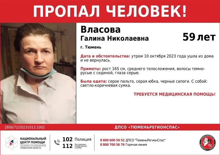 «Пропал человек! Галина Власова, 59 лет. Требуется медицинская помощь. Утром 10 октября 2023 года ушла из дома и не вернулась», — сообщается в ориентировке.