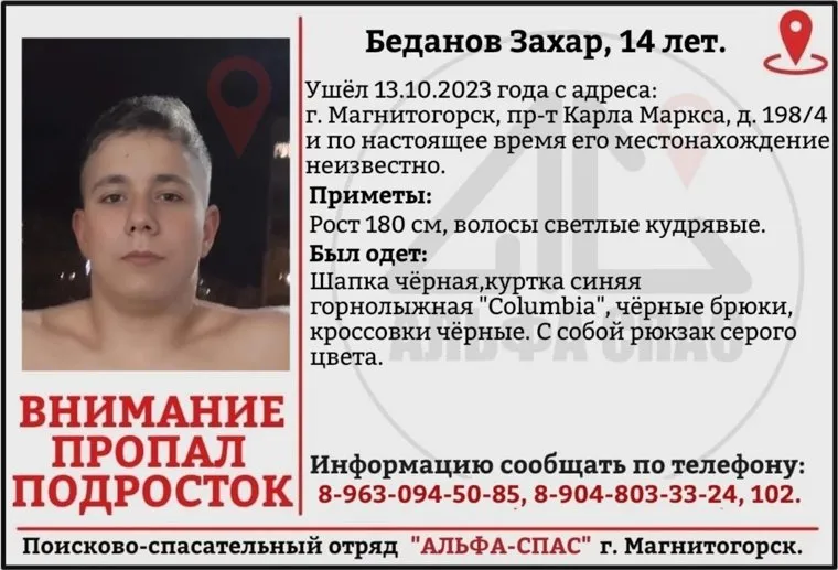 «Разыскивается Захар Б., 14 лет. Ушел 13.10.2023 с адреса: г. Магнитогорск, пр-т Карла Маркса, д. 198/4 и по настоящее время его местонахождение не известно», — указано в паблике Поисково-спасательный отряд «Альфа-Спас» город Магнитогорск в социальной сети «ВКонтакте».