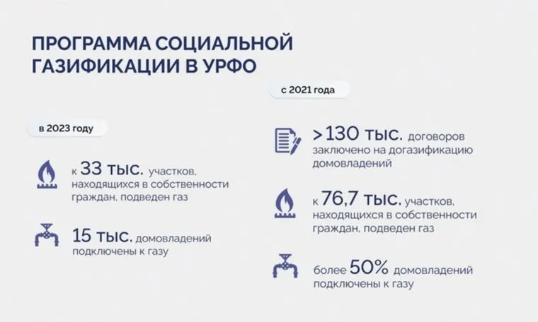 «С 2021 года — с начала действия программы социальной газификации — в Уральском федеральном округе заключено более 130 тысяч договоров на догазификацию домовладений. Газ подведен к 76,7 тысячи участков, находящихся в собственности граждан. Более 50% домов уже подключены к газу», — говорится в сообщении. Полпред УрФО Владимир Якушев также отметил, что «переходя на более экологически чистое топливо — природный газ — люди значительно экономят на энергоресурсах».