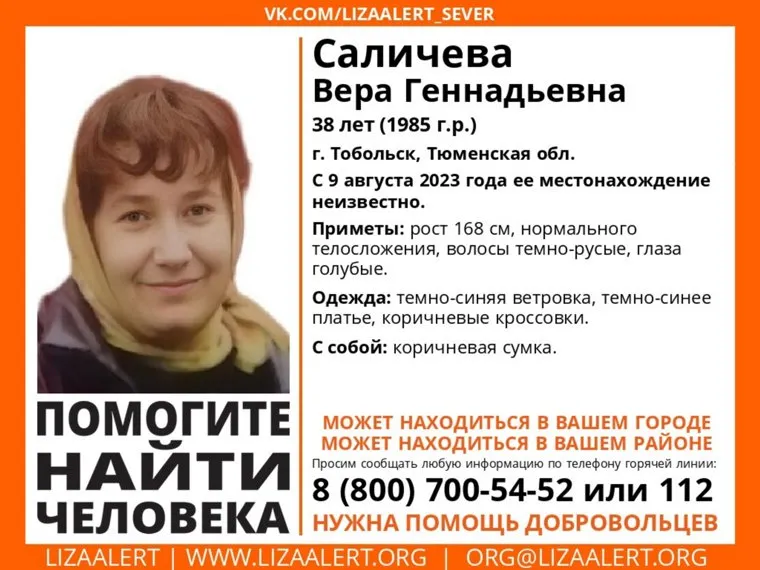 «В Тобольске пропала Вера Саличева 1985 года рождения. С 9 августа ее местонахождение неизвестно. У нее рост 168 сантиметров, волосы темно-русые, глаза голубые», — сообщают поисковики в соцсети «ВКонтакте».