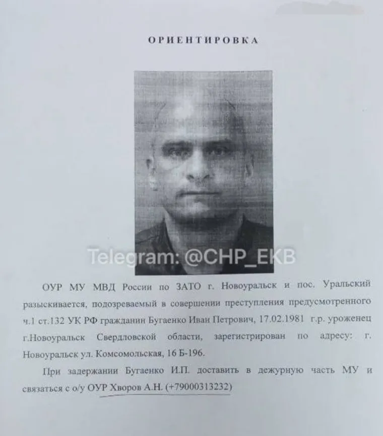 «Разыскивается подозреваемый в совершении преступления предусмотренного ч. 1 ст. 132 УК РФ (насильственные действия сексуального характера) гражданин Бугаенко Иван Петрович, 17.02.1981 года рождения. При задержании Бугаенко доставить в дежурную часть», — говорится в ориентировке. Ее опубликовал telegram-канал «Екатеринбург ЧП». Источник в силовых структурах подтвердил URA.RU информацию, что Бугаенко находится в розыске.