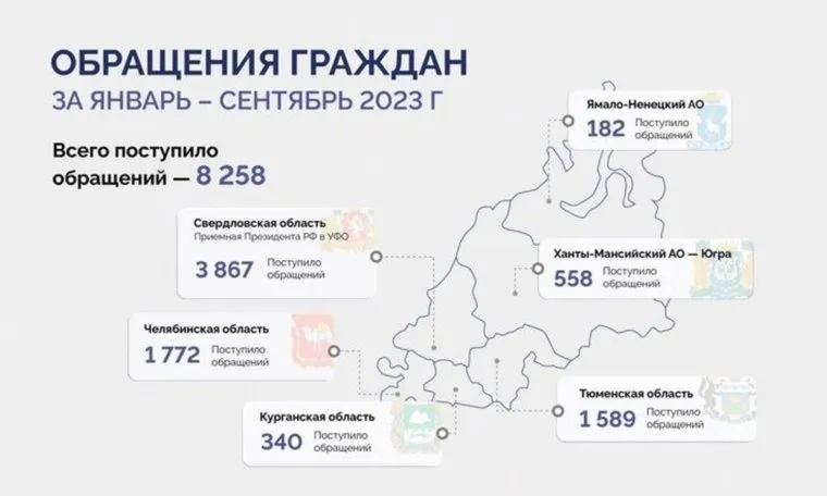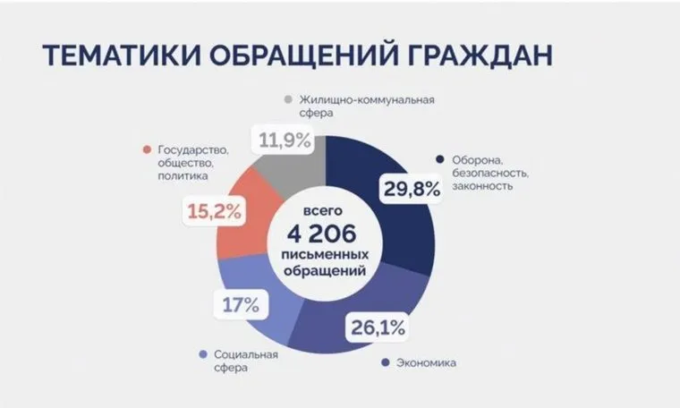 «За 9 месяцев 2023 года в аппарате полпреда рассмотрели 8 258 обращений граждан. Тематика обращений касалась, как правило, жилищно-коммунальной и социальной сферы, вопросов экономического характера. Чуть менее трети обращений граждан (29,8% от общего числа) касались темы обороны, безопасности и законности. Значительную часть из них составляют заявления участников СВО и их родных», — говорится в сообщении.