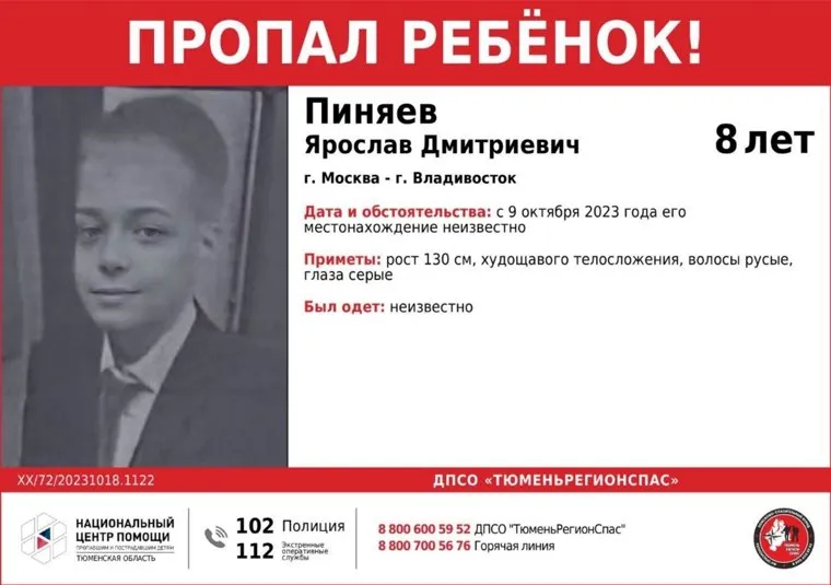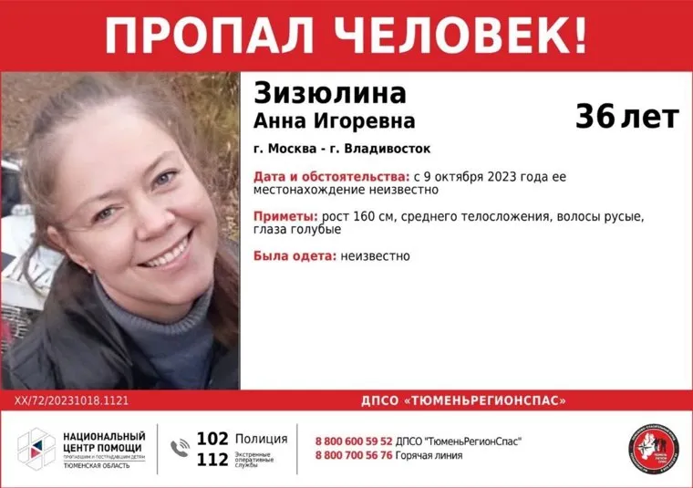 «ВНИМАНИЕ! Пропал человек! Зизюлина Анна Игоревна 1987 г. р. (36 лет), сын Пиняев Ярослав Дмитриевич 2015 г. р. (8 лет). С 9 октября 2023 года их местонахождение неизвестно. Могут находиться в вашем городе!» — указано в публикации ДПСО «ТюменьРегионСпас».