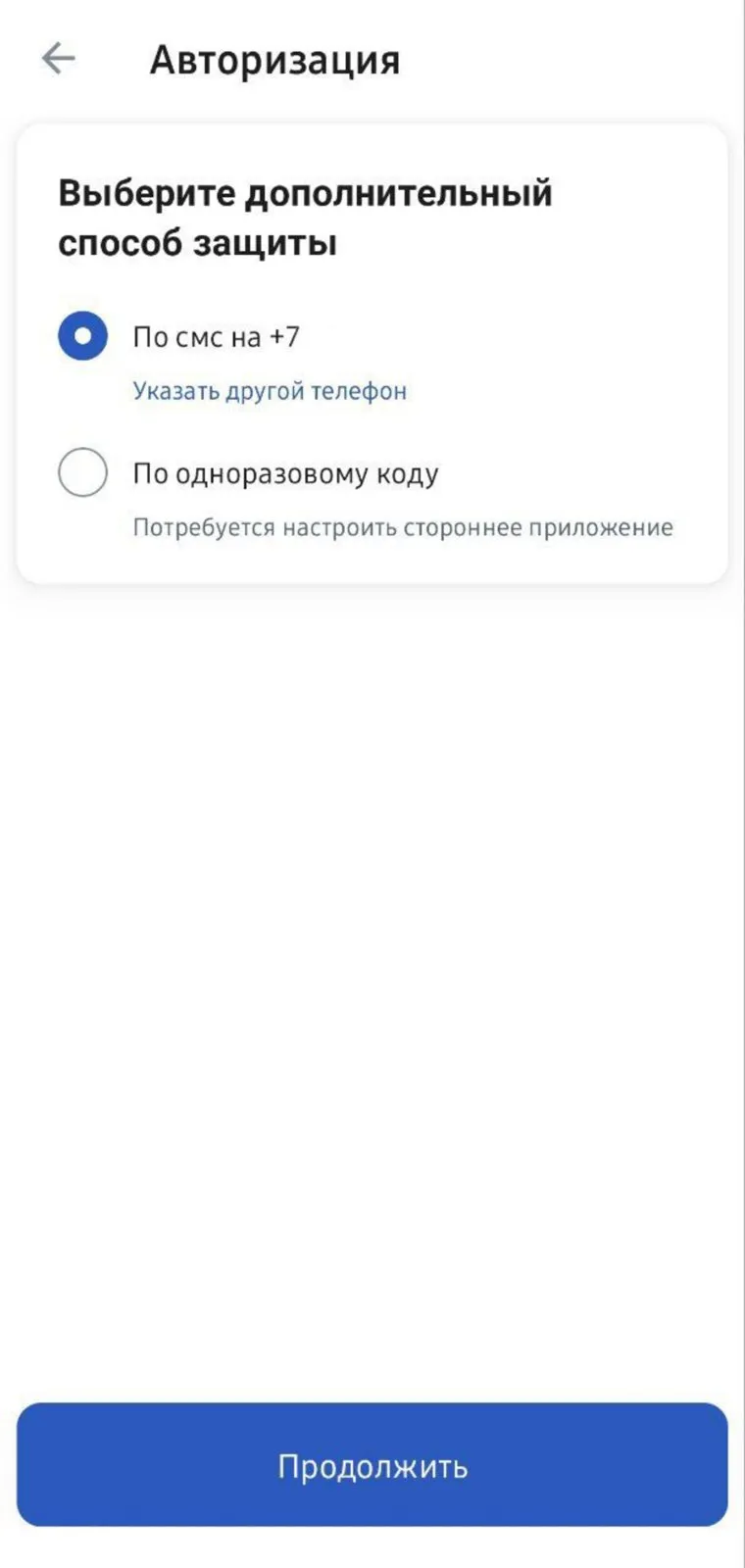 На втором этапе человеку предлагается выбрать способ для подтверждения личности. Пользователь может нажать на «отправить код по смс», «воспользоваться одноразовым кодом через стороннее приложение» или «использовать биометрию». Номер телефона для входа на этом этапе указан тот же, что и для личного профиля на «Госуслугах». Если человек хочет выбрать стороннее приложение, то сервис подскажет, как это сделать.