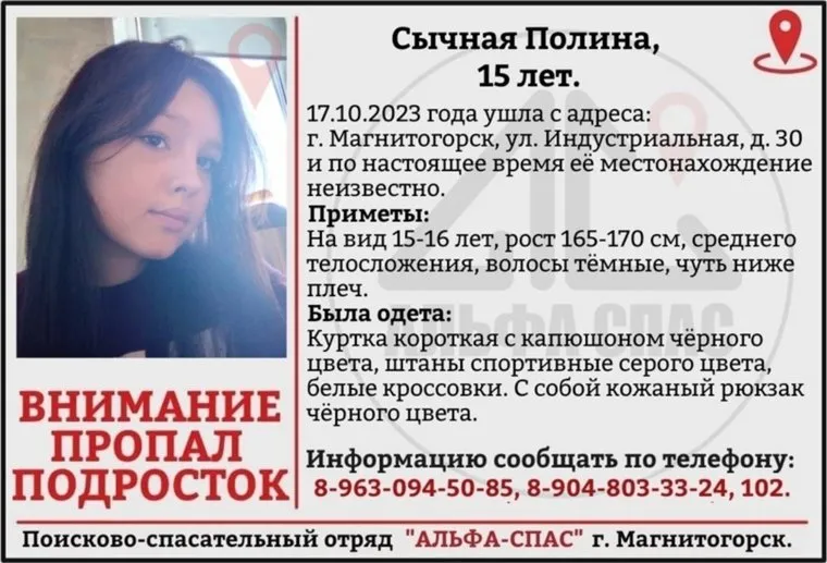 «Поисково-спасательный отряд „Альфа-Спас“ Магнитогорска разыскивает пропавшую Полину Сычную. Ушла с адреса по улице Индустриальной, дом 30, 17 октября и до настоящего времени о ее местонахождении неизвестно», — отметили в отряде.