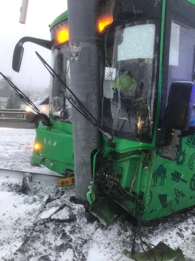 В Челябинске автобус врезался в столб после столкновения с легковушкой. Фото