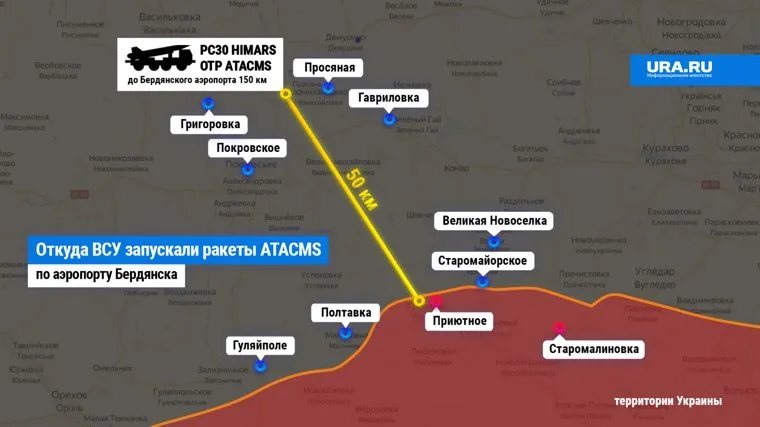 Анонимный telegram-канал «Рыбарь» определил точную позицию с которой ВСУ осуществили пуск ракет по аэродрому в Бердянске. По приведенной информации, установка реактивного залпового огня (РСЗО) HIMARS находилась в окрестностях Яблоновки на юго-востоке Днепропетровской области в 150 км от города. Отмечается, что после атаки ее отвели в тыл, чтобы не допустить обнаружения.
