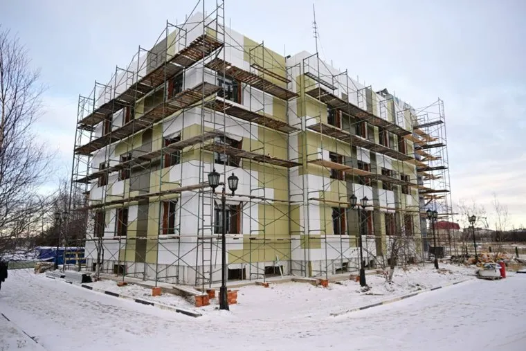Рабочие занимаются отделкой фасада и внутренними работами