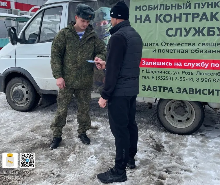 «В Шадринске работает мобильный пункт отбора на контрактную службу. Он будет ежедневно работать в часы пик. Дислокацию планируется менять для удобства горожан. Для заключения контракта мужчины в возрасте 18-60 лет», — говорится в сообщении мэрии.