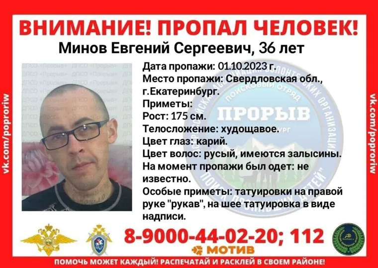 «36-летний Минов Евгений Сергеевич пропал 1 октября в Екатеринбурге. Приметы мужчины: рост 175 сантиметров, худощавое телосложение, волосы русые, имеются залысины, карие глаза. Из особых примет у мужчины татуировка в виде надписи на шее и „рукав“ на правой руке», — сообщается в группе поискового отряда соцсети «ВКонтакте».