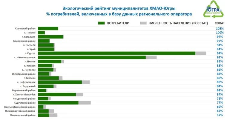 Согласно рейтингу компании по проценту охвата населения в муниципалитетах, тройку лидеров составляют Советский район, города Покачи и Когалым. Хуже всего ситуация в Нефтеюганском районе — там за вывоз мусора платят только 57% жителей. Как отметили в «Югра-Экология», вывоз ТКО идет во всех муниципалитетах и в полном объеме, поэтому плата за услугу также должна быть полная.