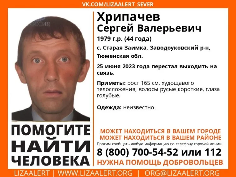 «В Старой Заимке пропал Сергей Хрипачев 1979 года рождения. С 25 июня 2023 года перестал выходить на связь. У пропавшего худощавое телосложение, рост 165 сантиметров, волосы русые, глаза голубые. Неизвестно, во что был одет мужчина», — написали поисковики на странице «ВКонтакте».