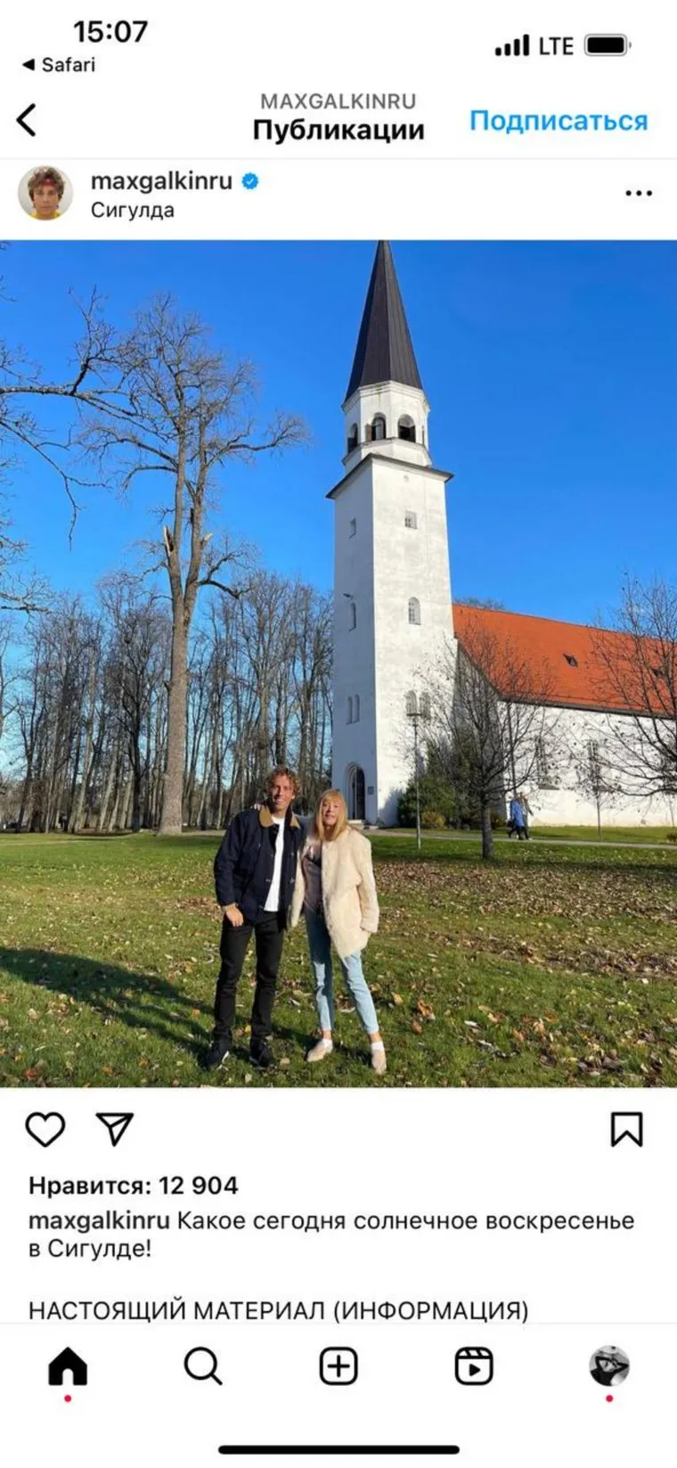 «Какое сегодня солнечное воскресенье в Сигулде!» — подписал пост Галкин. На фото он вместе с женой позирует на фоне Сигулдской евангелическо-лютеранской церкви.