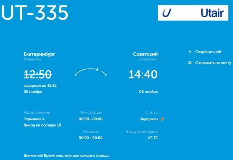 В Екатеринбурге 6 ноября задержали вылет рейса UT-335 авиакомпании Utair в Советский (ХМАО). Информация об этом появилась на онлайн-табло аэропорта Кольцово.