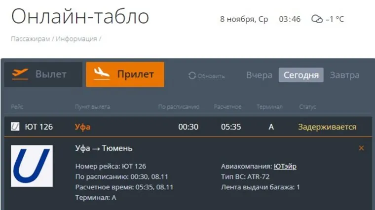 «Рейс авиакомпании Utair из Уфы в Тюмень задержан. Плановое время прибытия 8 ноября в 00:30, расчетное время прибытия — 5:35. Задержка в связи с поздним прибытием воздушного судна в Уфу», — сообщили в пресс-службе аэропорта «Рощино». Информация подтверждается на онлайн-табло.