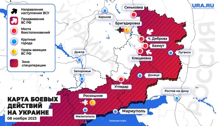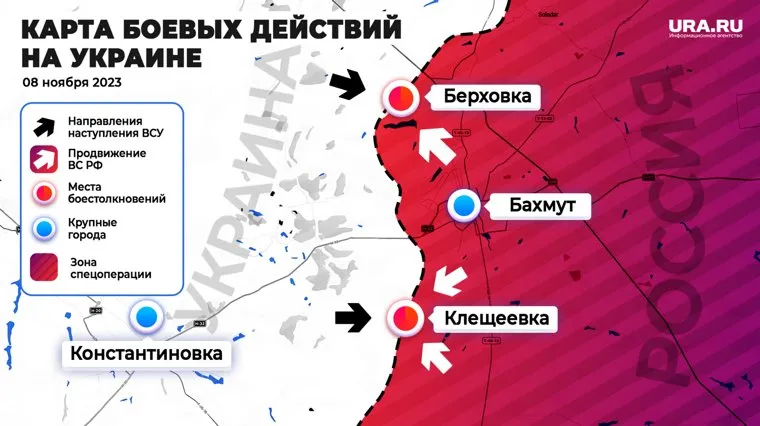 Российские военные уничтожили бронеавтомобиль Вооруженных сил Украины (ВСУ) в районе Бахмута (Артемовска), а также продвинулись на 1,5 километра на юг от города в направлении участка железной дороги между населенными пунктами Ягодное и Богдановка. URA.RU публикует карту боевых действий на 8 ноября.