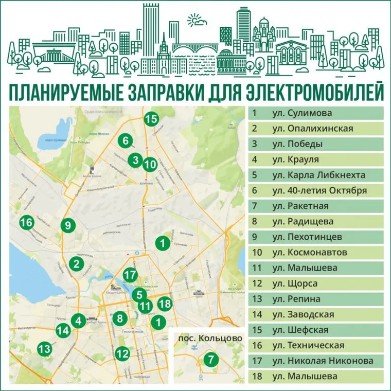 18 электрических зарядных станций для электромобилей установят по всех районах уральской столицы