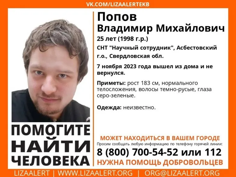 В свердловском СНТ «Научный сотрудник» Асбестовского городского округа пропал 25-летний Владимир Попов. С 7 ноября его местонахождение неизвестно, сообщили в пресс-службе регионального поисково-спасательного отряда «ЛизаАлерт».