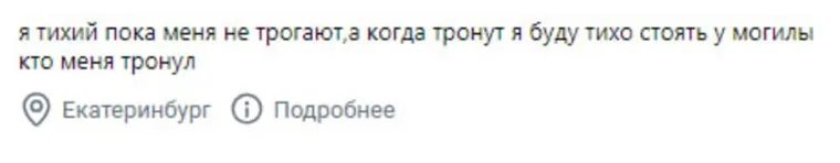 «Я тихий, пока меня не трогают, а когда тронут, я буду тихо стоять у могилы [того], кто меня тронул», — написано в статусе молодого человека. Ранее стало известно, что в Екатеринбурге школьника подозревают в убийстве 14-летней подруги из ревности. Он трижды ударил ее ножом в спину и шею.