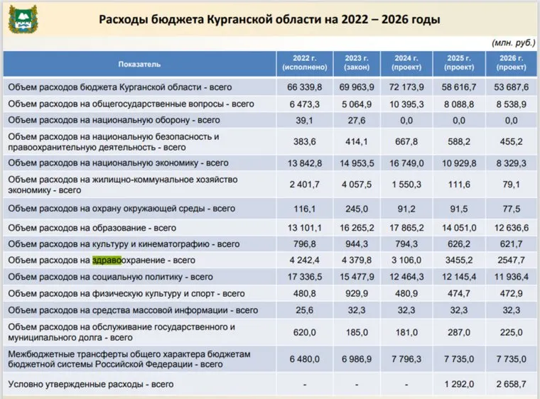 В Курганской области планируется сократить на 30% объем расходов на здравоохранение. Об этом во время эфира в группе «Зауральский плацдарм» в соцсети «ВКонтакте» сообщил лидер реготделения КПРФ Виктор Зырянов, со ссылкой на проект закона «Об областном бюджете на 2024 год и на плановый период 2025 и 2026 годов».