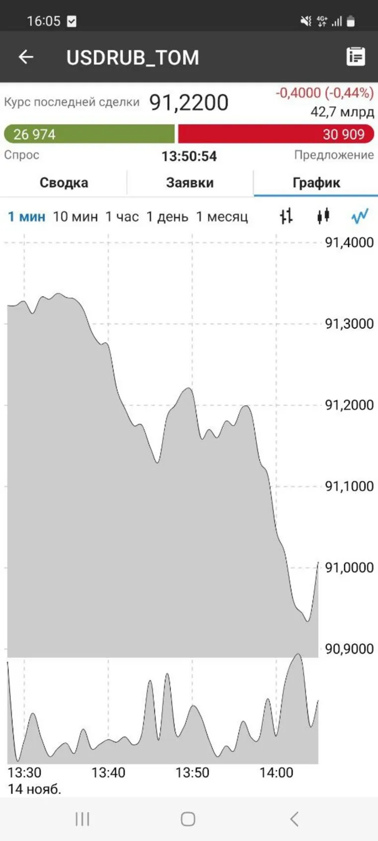 Курс доллара опустился до 91 рубля. Скрин