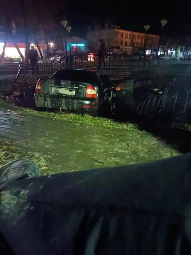 В Щучье (Курганская область) машина на огромной скорости въехала в пруд городского парка. Об этом URA.RU сообщил читатель.