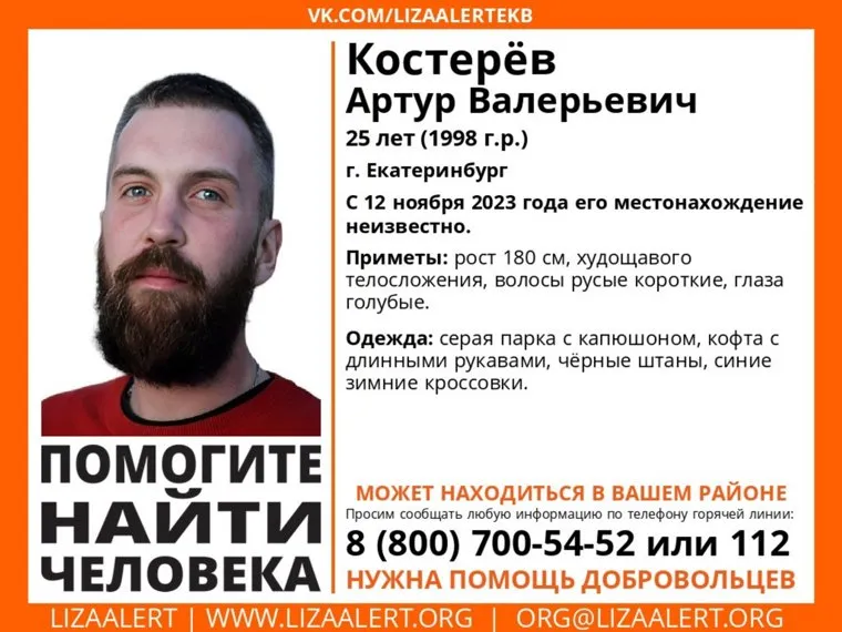 «Помогите найти человека! В Екатеринбурге пропал Костерев Артур Валерьевич, 25 лет. Может находиться в вашем районе», — говорится в сообщении волонтеров.