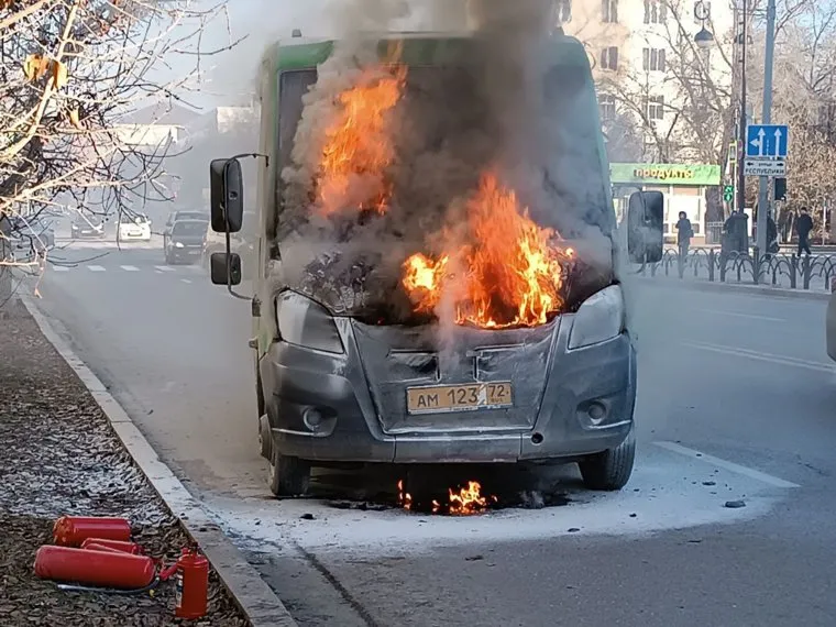 В центре Тюмени загорелся автобус. Фото, видео