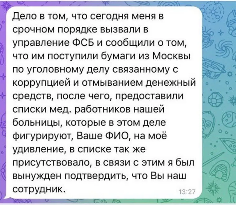 «Многим сотрудникам „Скорой помощи“ пришло смс от руководителя. На самом деле он его не отправлял», — делится источник. Автор сообщения утверждал, что адресата разыскивает ФСБ.