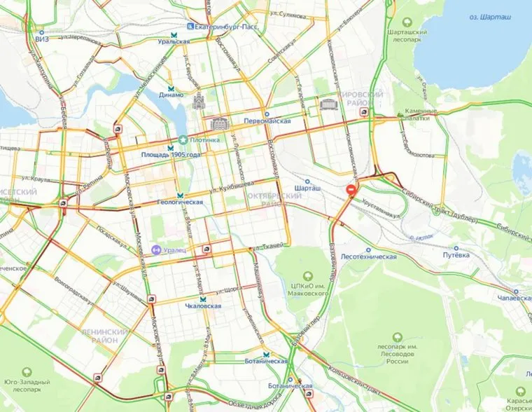 Судя по «Яндекс Карте», город стоит в восьмибалльных пробках. За 15-минутную поездку на такси от главного корпуса Уральского федерального университета до Главпочтамта придется отдать до 430 рублей.