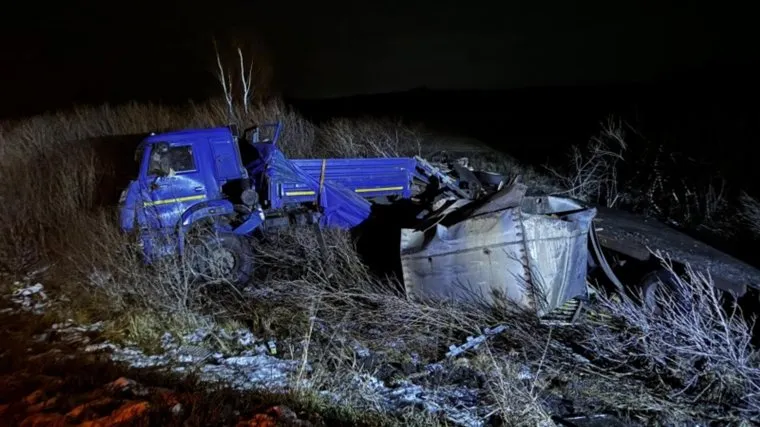 Пьяный курганский сторож угнал КамАЗ с прицепом и слетел на нем в кювет. Фото