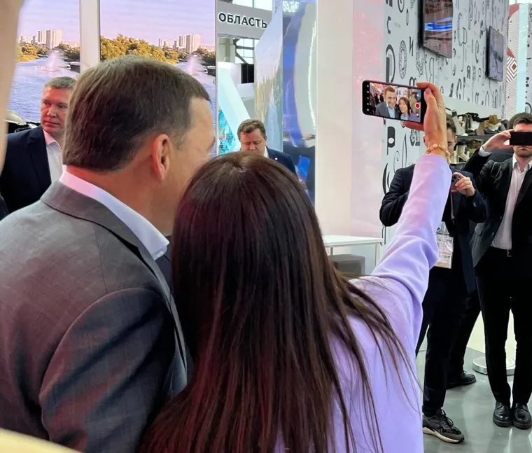 Молодые посетители стенда фотографировались со свердловским губернатором