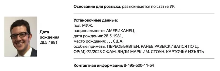 «Стоун Энди Марк разыскивается по статье УК РФ», — следует из базы данных. Номер статьи не уточняется.