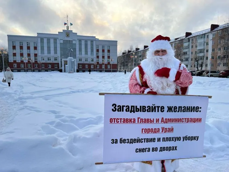 В Урае коммунист Дмитрий Зеленский решил пикетировать мэрию в костюме Деда Мороза. Он потребовал отставки главы города Тимура Закирзянова и местной администрации. Об этом журналисту URA.RU рассказал депутат гордумы Леонард Насибуллин, предоставив в распоряжение редакции фото пикета.