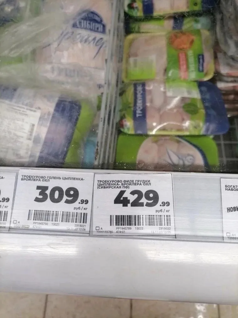 Жителей города Березники (Пермский край) возмутила стоимость куриного мяса в одном из магазинов. Покупателям предлагают филе грудки цыпленка-бройлера за 429,99 рублей, а голень за 309,99 рублей. Фотография с ценами опубликована в группе «ЧП Березники» в соцсети «ВКонтакте».