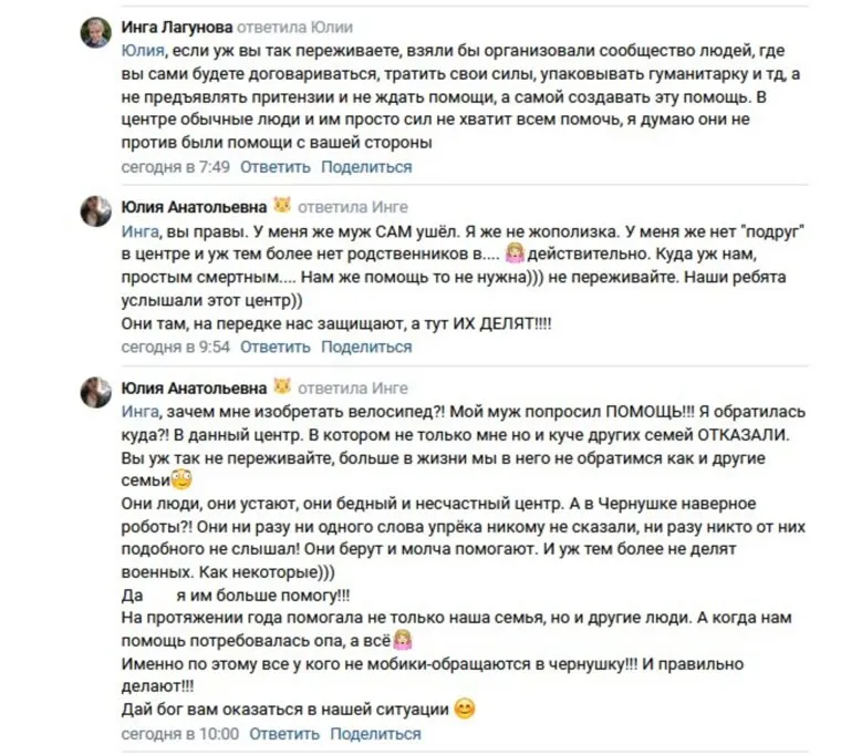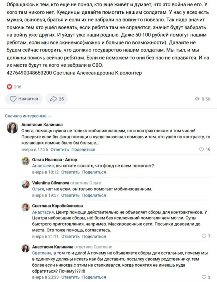 «Ольга, помощь нужна не только мобилизованным, но и контрактникам! Поверьте, если бы фонд [Центр помощи мобилизованным помощи] в Куеде оказывал помощь и тем, кто ушел [на СВО] по контракту, то желающих помочь было бы больше […] Почему не объявляете сборы для остальных? Почему мы в одиночку должны искать, как доставить посылку своему родственнику, тем более если никогда с этим не сталкивались?» — написала Анастасия. Несколько жительниц заочно согласились с позицией Калининой. Они написали, что в вопросе оказания помощи участникам спецоперации не стоит делить их на мобилизованных и контрактников.