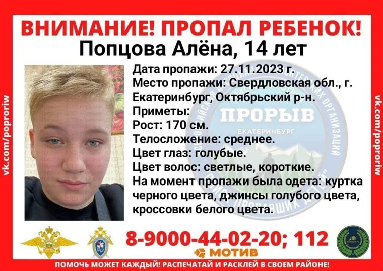 «Внимание! Пропал ребенок! Алена Попцова пропала 27 ноября в Октябрьском районе. Приметы: рост 170 сантиметров, среднее телосложение, голубые глаза, короткие волосы светлого цвета. На момент пропажи была одета в черную куртку, голубые джинсы и белые кроссовки», — следует из сообщения.