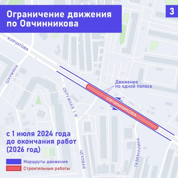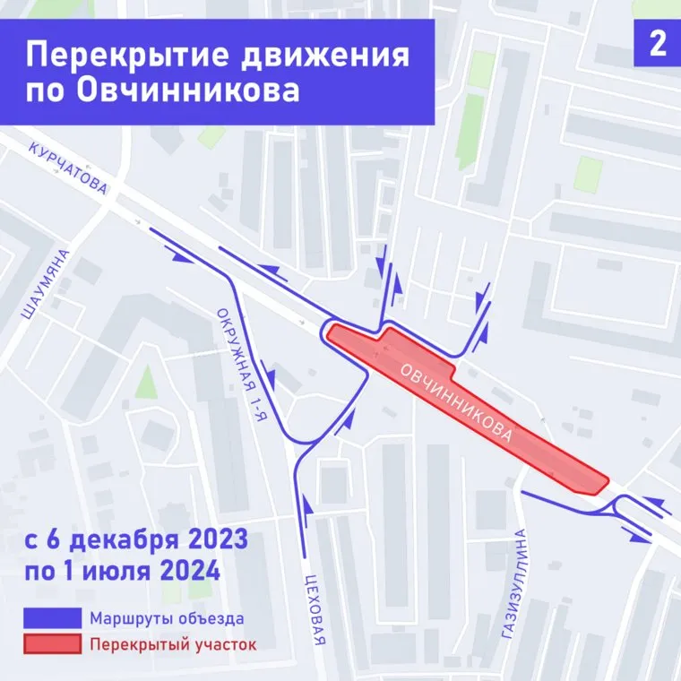 «С 6 декабря 2023 года до 1 июля 2024 года будет закрыт сквозной проезд по улице Овчинникова. Ограничения коснутся участка от улицы Окружная-1 до улицы Замятина», — уточнили URA.RU в министерстве.