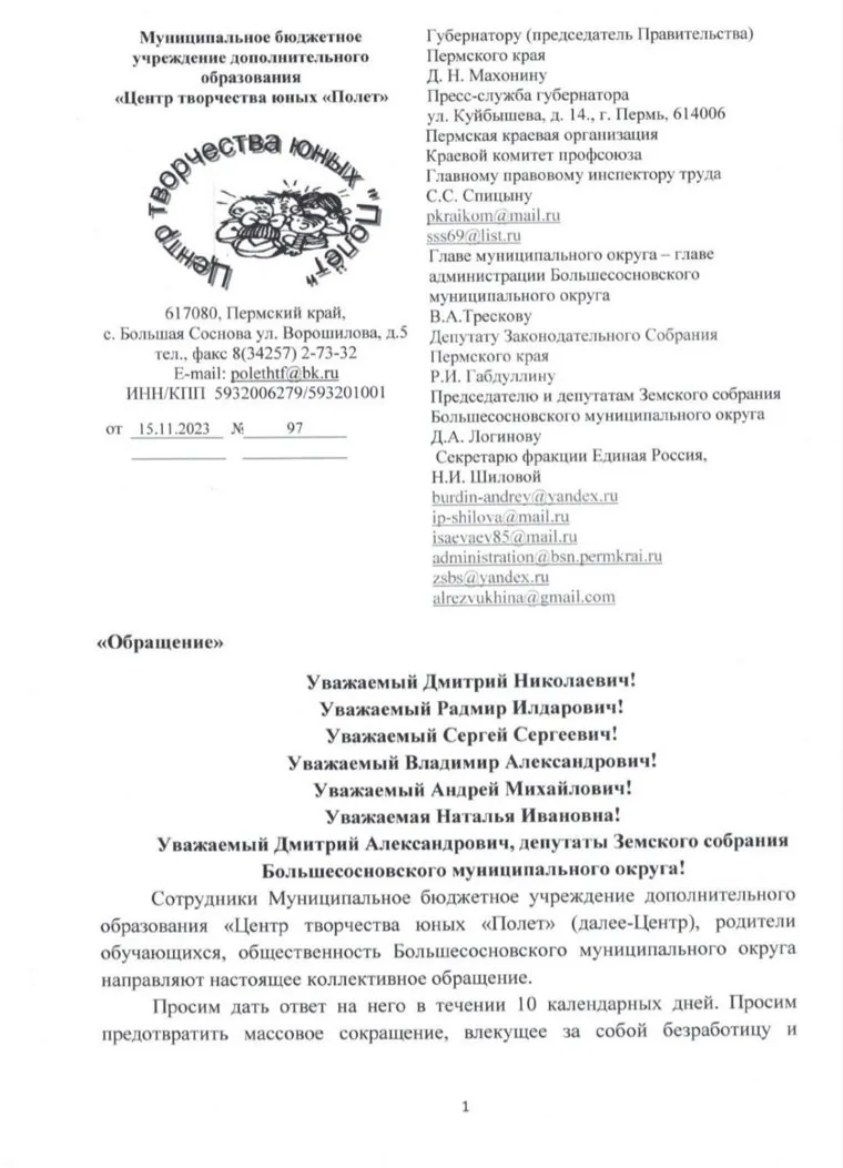 В селе Большая Соснова педагоги дополнительного образования детского центра творчества «Полет» написали коллективное обращение на имя губернатора Дмитрия Махонина. Поводом послужили планы властей провести массовое сокращение в учреждении. Обращение разместил на своей странице в соцсети «ВКонтакте» депутат думы Большесосновского муниципального округа Андрей Бурдин, к которому также обратились преподаватели.