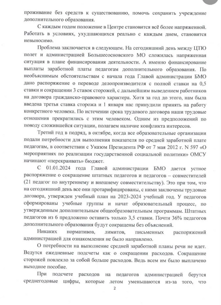 «Просим предотвратить массовое сокращение [педагогов], влекущее за собой безработицу и проживание без средств к существованию, помочь сохранить учреждение дополнительного образования. С 1 января 2024 года главой Большесосновского округа дано устное распоряжение о сокращении штатных педагогов и педагогов-совместителей (21 педагог по внутреннему и внешнему совместительству). Это при том, что все они тарифицированы, с ними заключены трудовые договоры, утвержден учебный план на 2023-24 годы», — говорится в обращении.