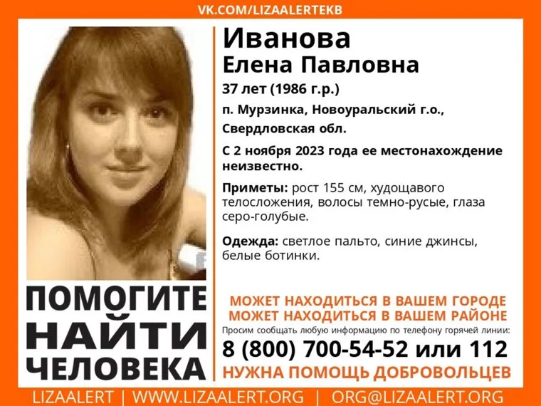 «Внимание! Помогите найти человека! В поселке Мурзинка, Новоуральский городской округ пропала Иванова Елена Павловна 1986 года рождения. Приметы: рост 155 сантиметров, худощавое телосложение, темно-русые волосы, серо-голубые глаза. Была одета в светлое пальто, синие джинсы и белые ботинки», — сказано в сообщении.