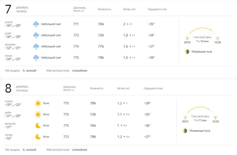 «На территории Кургана в четверг 7 декабря температура воздуха ночью 32 градуса ниже нуля. Температура днем поднимется до -29 градусов. Ветер порывами до 7 м/c. Утром 8 декабря ожидается температура воздуха до -36 градусов. Ветер 1-3 м/», — указано на сайте сервиса о погоде. По данным «Яндекс Погода», в Кургане утром в четверг ожидается температура 30 градусов ниже нуля с ветром до двух метров в секунду. Восьмого декабря утром будет до минус 35 с небольшим ветром.
