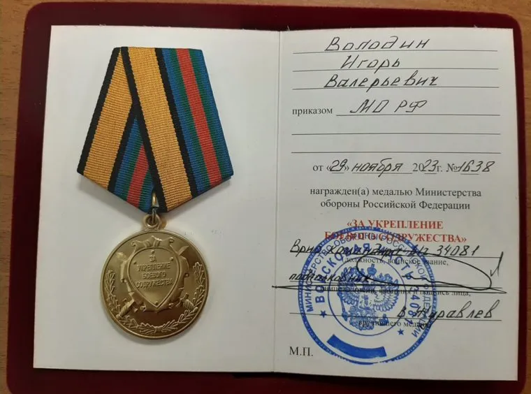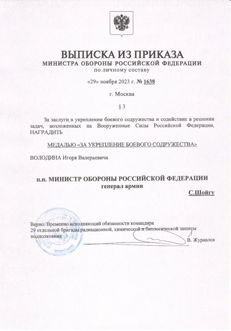 «За заслуги в укреплении боевого содружества и содействие в решении задач, возложенных на Вооруженные силы Российской Федерации», — говорится в приказе Шойгу от 29 ноября. По словам Володина, награда — следствие его участия в гуманитарных миссиях: помощь солдатам-участникам спецоперации РФ на Украине он отправляет как минимум раз в месяц.