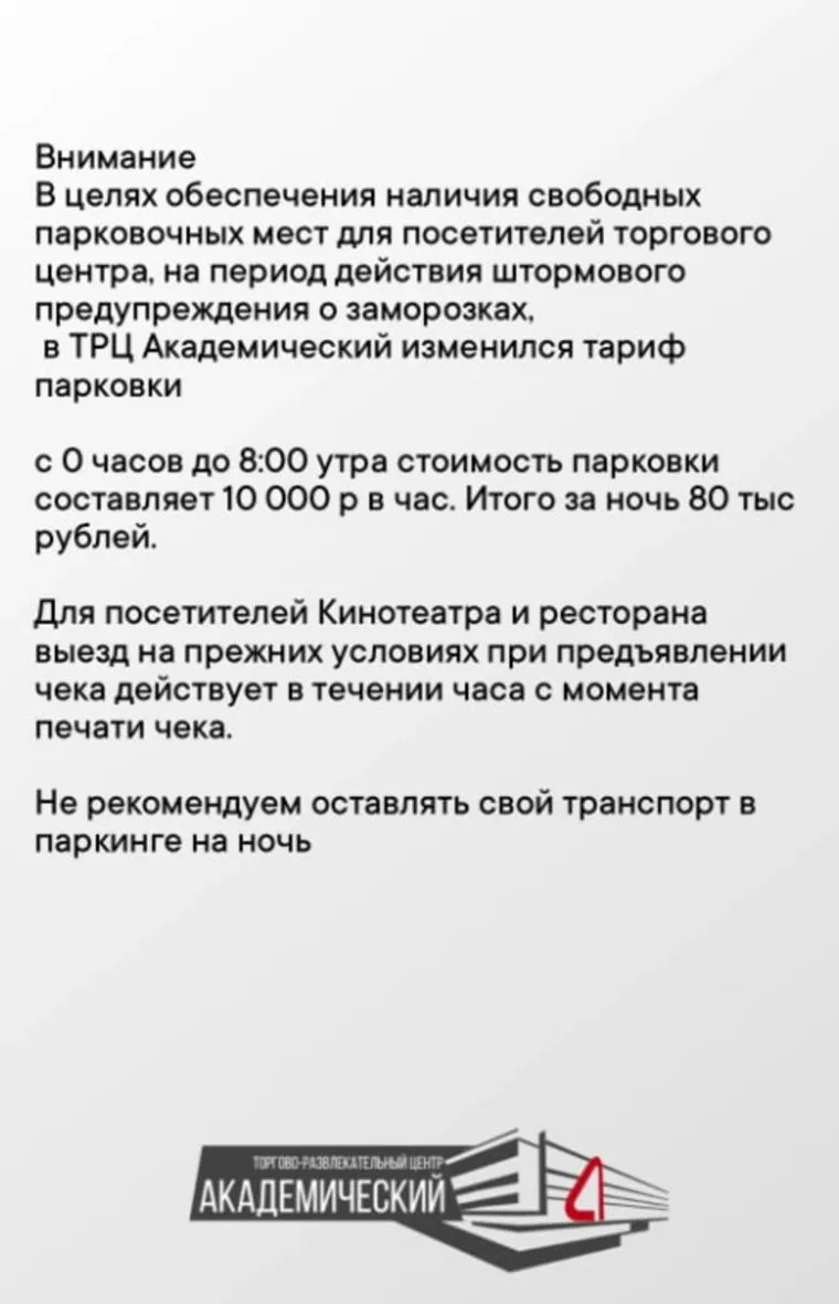 «В целях обеспечения наличия свободных парковочных мест для посетителей торгового центра, на период действия штормового предупреждения о заморозках, в ТРЦ Академический изменился тариф парковки. С 00:00 до 08:00 утра стоимость парковки составляет десять тысяч рублей в час. Итого за ночь 80 тысяч рублей», — следует из объявления в сообществе «ТРЦ Академический, г. Екатеринбург» соцсети «ВКонтакте».