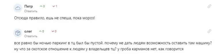 «Четыре пенсии… за ночь», — пишет в комментариях читатель URA.RU. «Все равно бы ночью паркинг в ТЦ был бы пустой. Почему не дать людям возможность оставить там машину? Ну что за отношение к людям у владельцев ТЦ? У гроба карманов нет, как говорится», — пишет другой.