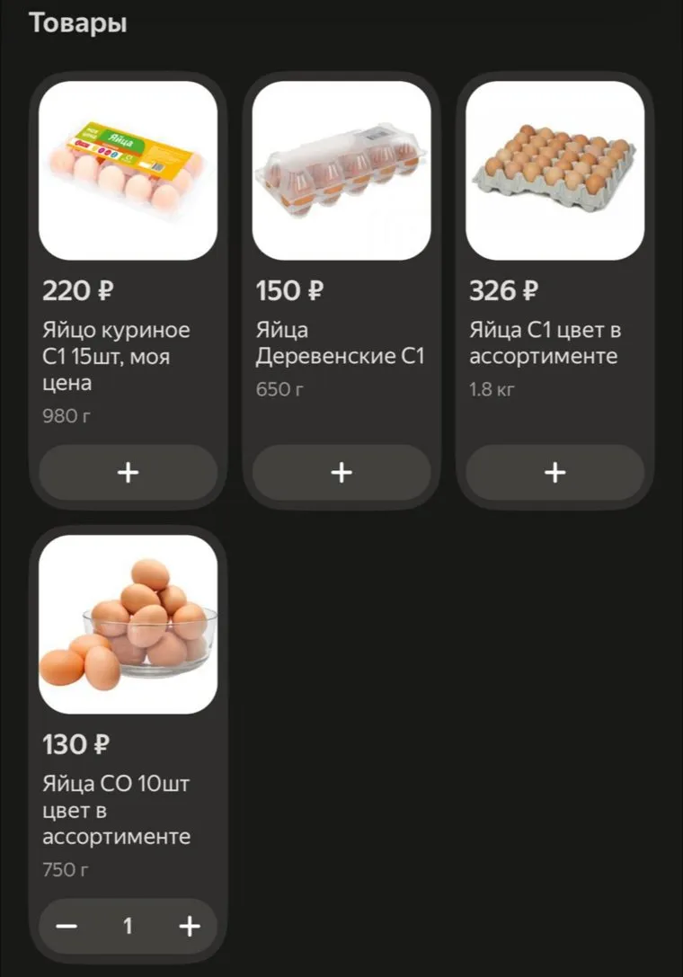 Стоимость яиц в «Монетке» — 129,99 рублей за десяток (С0 и С1), в «Бристоле» — 129,99 рублей (C1), в «Пятерочке» — 120-125 рублей (С0), 110-126 рублей (С1), «Перекрестке» 119,99-126,99 рублей (С0), 104,99-111,99 рублей (С1), в «Верном» — 120 рублей (С0), 110 рублей (С1).