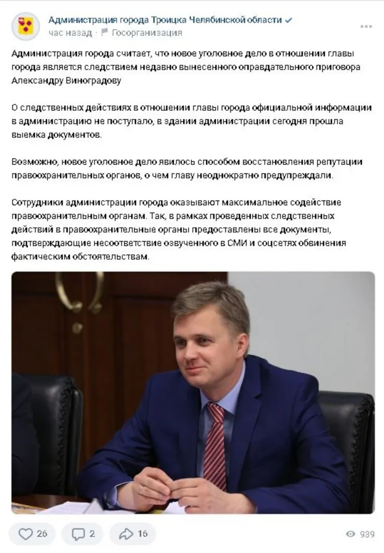 В администрации Троицка (Челябинская область) назвали новое уголовное дело в отношении мэра Александра Виноградова следствием недавно вынесенного оправдательного приговора и способом восстановления репутации силовиков. Официальное заявление появилось 13 декабря на странице мэрии в соцсети.